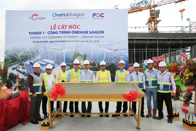 Lễ cất nóc Tower 1 dự án OneHub Saigon được xây dựng hoàn thiện. Đại diện của Ascendas- Singbridge và Saigon Bund Capital Partners đã cùng tham gia sự kiện quan trọng này.
